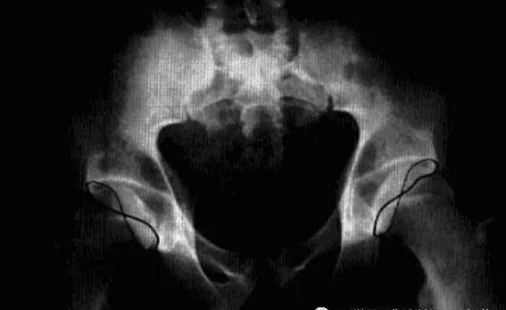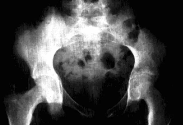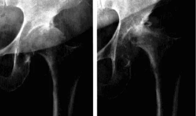1、平片:活动期表现骨质疏松,股骨头和转子间弥漫性骨密度减低,股骨头软骨下骨皮质吸收,髋臼受累程度轻,无骨侵蚀或破坏,关节间隙保持正常。