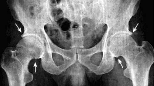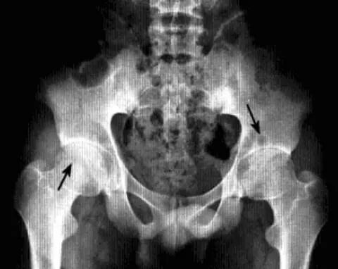 临床表现:好发于中年男性或怀孕3个月左右女性,单侧或双侧均可发病,主要症状为无任何诱因出现髋部剧烈疼痛,呈渐进性并放射至膝关节,伴髋关节活动不利、跛行,疼痛加重约在发病后4-8周,并持续一段时间,之后疼痛逐渐减轻至消失,病程约6-12个月,髋部肌肉及股四头肌呈失用性萎缩。实验室检查阴性。