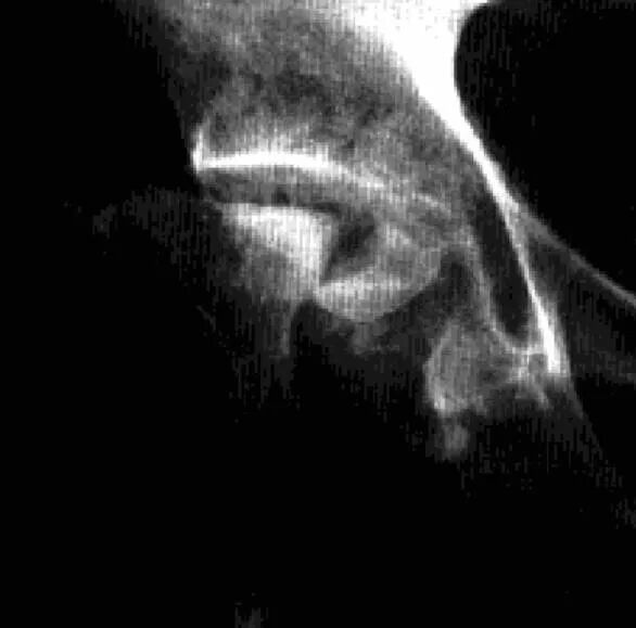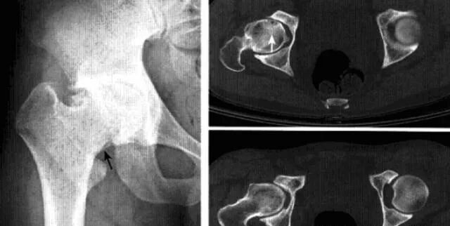 2、CT:髋关节腔内高密度或钙化,关节囊增厚,软骨下骨质小圆形和不规则软组织密度区,伴周围硬化缘,正常骨纹理消失,骨端骨质疏松。长期者呈骨性关节炎改变。