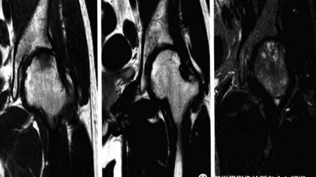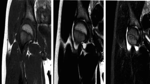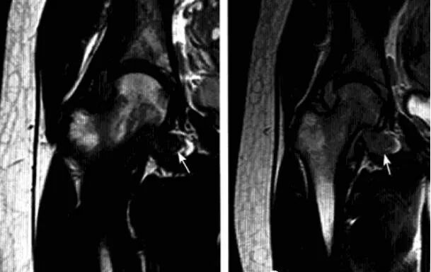 2、MRI:骨头至转子间在T1WI低信号,T2WI及脂肪抑制像呈均匀一致高信号,无局灶性改变,多伴髋关节积液,周围肌肉层次清晰,随访多于6-10个月内恢复正常,无后遗症。
