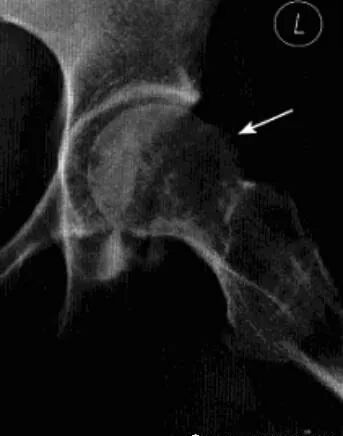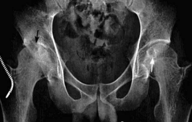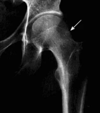 临床表现:多发生于60岁以上老年女性,多一侧发病,无明显原因髋关节疼痛,之后逐渐加重,后期出现功能受限和跛行。