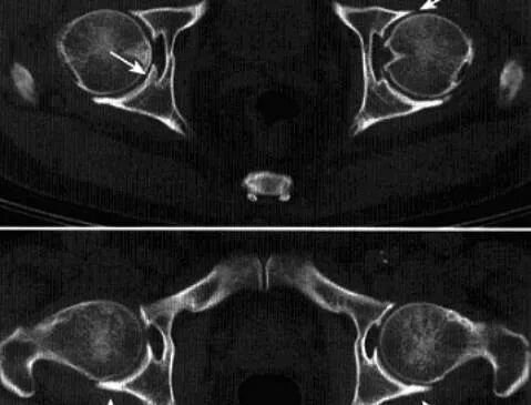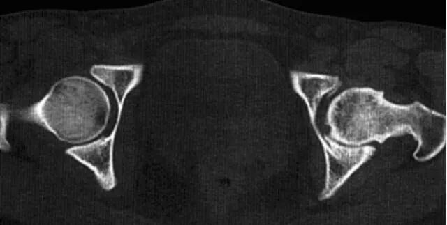 2、CT:急性期关节积液、周围软组织肿胀,关节间隙增宽,可合并骨折,继发性退行性骨关节病可出现髋关节间隙变窄,骨性关节面毛糙,边缘骨质增生,游离体,关节囊及周围软组织钙化或骨化影。