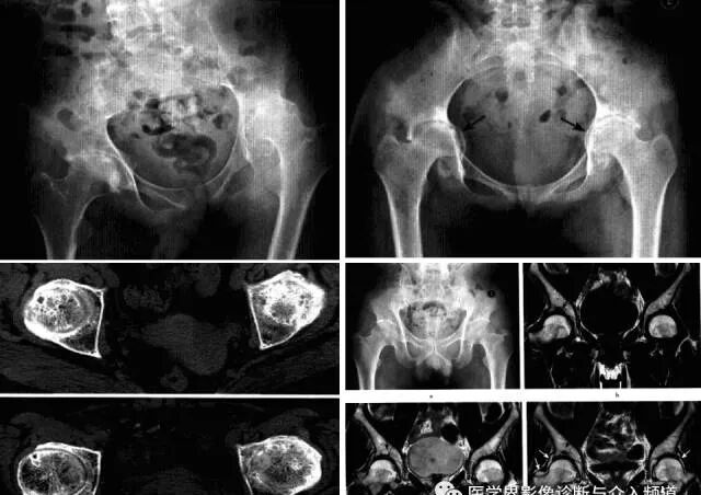 2、CT:早期髋关节积液,周围软组织水肿;随病情进展,骨端增生硬化,边缘骨赘形成,游离体;后期,骨端崩解,关节正常结构破坏,关节腔大量坏死骨块和钙化的软骨碎屑,周围软组织骨化、钙化,增强显示关节囊及滑膜囊明显强化、呈绒毛状突向关节腔。