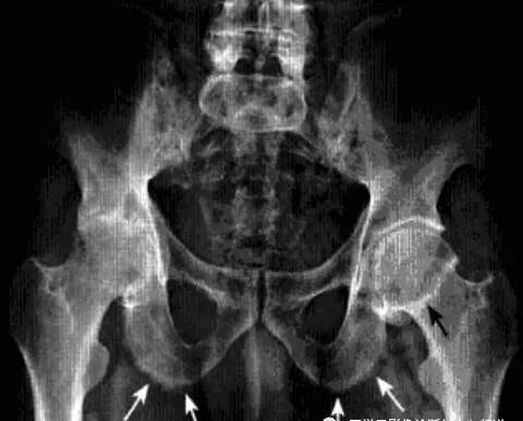 1、平片:双侧对称受累,早期骨质疏松,关节囊膨隆,股骨头及髋臼骨质侵蚀糜烂;中期关节间隙一致性狭窄,软骨下囊性变,关节面边缘骨质增生,坐骨结节、坐骨耻骨支及股骨大转子可伴骨膜炎;晚期股骨头内移、髋臼内突,关节腔闭锁呈骨性强直。