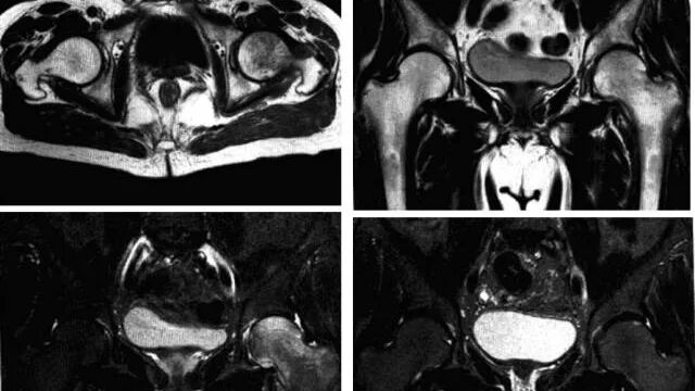 MRI:股骨头颈凹陷减少(α>50°),股骨颈宽度与股骨头半径比率增大,髋臼后倾。盂缘退行性改变,撕裂、囊肿,关节间隙后期出现狭窄,周围肌肉炎症。