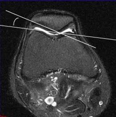 膝关节屈曲20度摄髌股关节轴位片,观察股骨内外侧髁前面切线与髌骨外侧关节面切线的交角,即外侧髌股角Laurin角),正常应开向外侧,而异常的开向内侧。即髌骨外翻外移。
