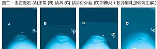 X线:早期X线表现可无异常,晚期可见骨赘形成,髌股关节间隙狭窄、毛糙、关节对合不良。