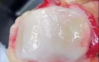 (图中白色部分为髌骨的软骨,发黄的部分是软骨剥脱区域)